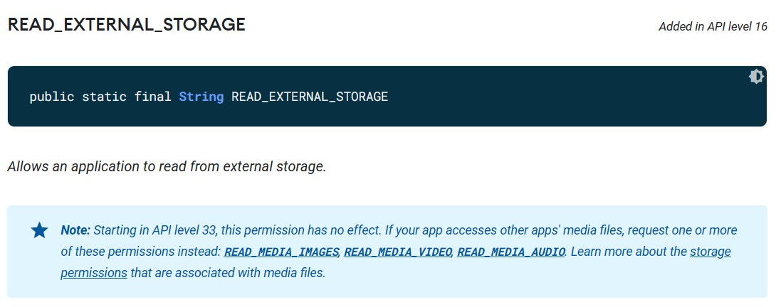 Android API 레벨 33, 그러니까 Android 13부터는 해당 권한을 이용할 수 없고, 이미지, 비디오, 오디오에 대한 권한을 각각 요청해주어야 한다는 내용이었다.