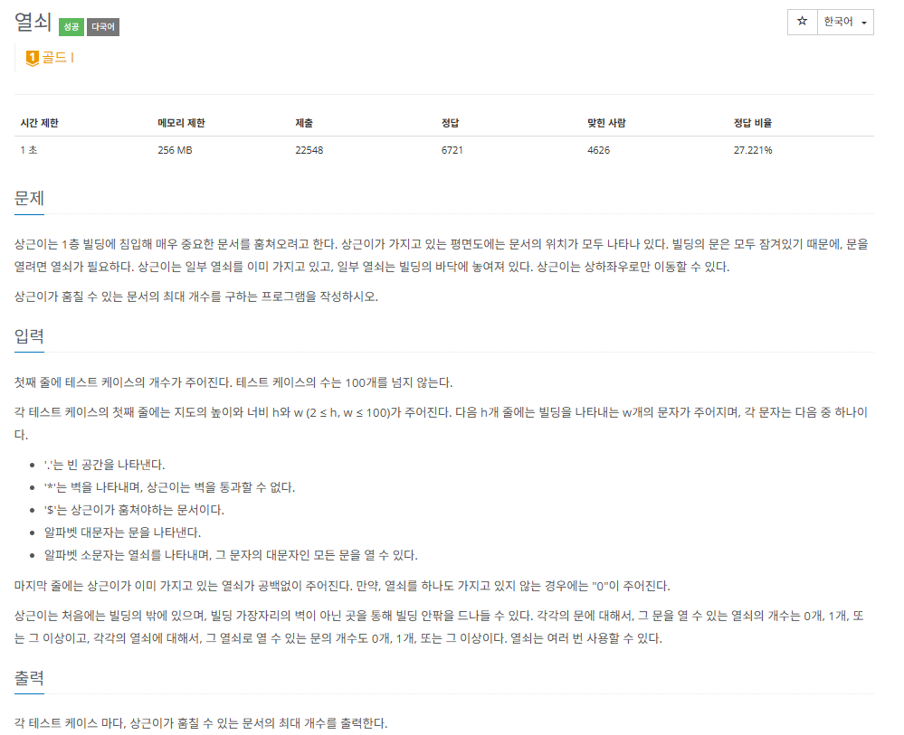 그래프 탐색 문제로 DFS나 BFS 등으로 풀 수 있다. 열쇠 처리를 구현 해주어야 하는데, 종류가 알파벳의 갯수인 26가지로 한정되어 있으므로 bool 배열을 이용해도 되고, 비트마스킹을 이용해도 된다. 나는 비트마스킹을 이용했다.