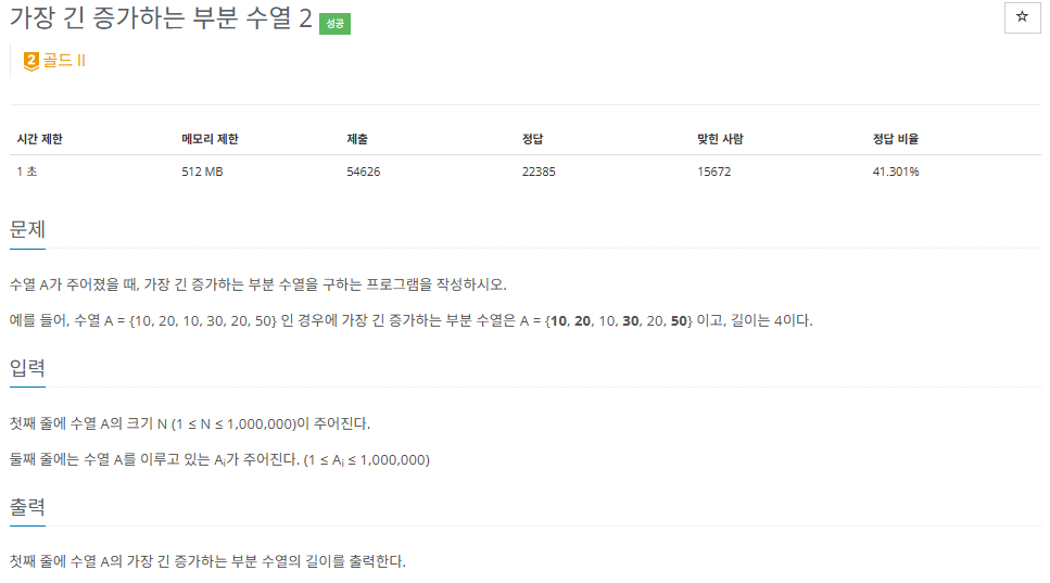 아마 알고리즘을 따로 공부했거나, 학부 과정에서 컴퓨터 알고리즘 과목을 수강했다면 익숙할 LIS 문제이다. 대표적인 DP 문제인데, 직관적으로 떠올릴 수 있는 형태의 DP 알고리즘의 시간복잡도는 O(n^2)로 이 문제를 풀기에는 부적합하다. 접근 방식을 조금 바꿔야 하는데, 나는 DP 문제에 약한 편이라 아무것도 모르는 체로 이 문제를 접했다면 발상에 꽤나 애먹었을 것 같다.