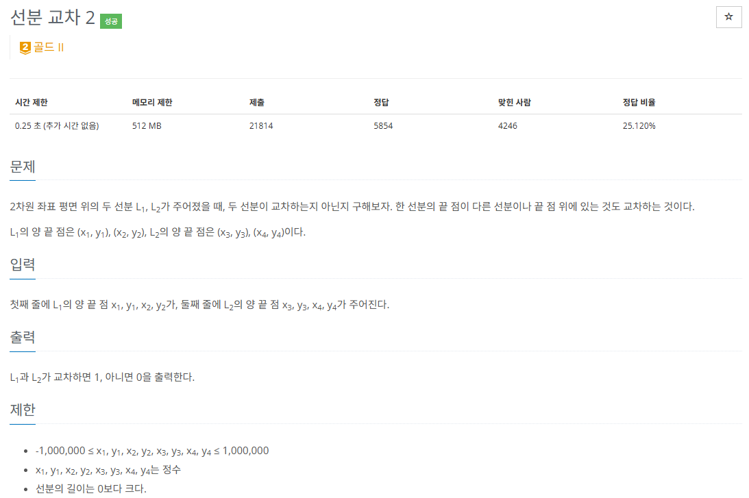 기하 알고리즘 문제이다. 처음에는 선분의 양 끝 점을 알고 있으므로, 두 개의 1차함수로 만들어 교점을 구해 그 점이 선분위에 있는지 찾는 방법을 사용했다. 두 함수의 기울기가 같을 때만 따로 처리해주었고, 문제에 있는 예제와 다양한 반례들을 넣어봐도 모두 바른 답이 나왔으나 정작 코드를 제출하면 3%에서 틀렸습니다가 발생했다.