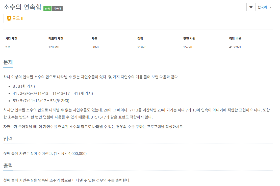 소수 판별하는 로직을 작성해, [1, N] 구간 내의 소수 배열을 완성했다면 제일 앞부터 탐색을 하면된다. 현재 합 값을 0으로 시작해서, 이 합 값이 N보다 작으면 right 포인터를 증가시키면서 오른쪽 끝의 새 원소를 더해주고, N보다 크다면 left 포인터를 증가시키면서 왼쪽 끝 원소를 빼주면 된다. 합 값이 N과 같으면 결과로 출력할 변수의 값을 1 증가시키고, right나 left 포인터 중 하나를 증가시키는 과정을 실행해서 다음 탐색을 이어가도록 한다.