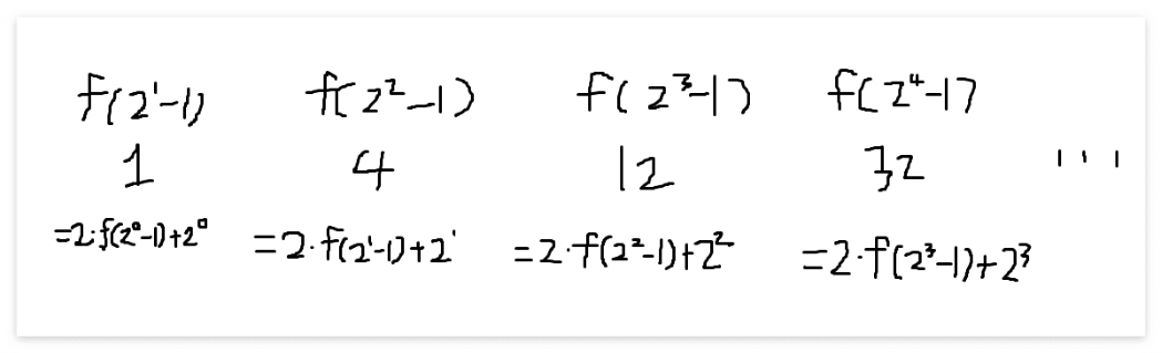 이 f(x)=f((2^n)-1) (n은 0 이상의 정수)에서, x=1(2), 11(2), 111(2), 1111(2), ... 일 때 성립하며, 이는 2^n번째 비트가 1이고 나머지 비트가 0인 자연수가 등장하기 직전까지 누적되어 온 1의 합을 의미한다.