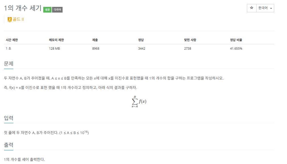 수학 기반 구현 문제다. 구간 사이의 모든 이진수 형태의 자연수에 대해 하나하나 1의 개수를 구하면 시간 내에 풀 수 없다. DP를 활용한다고 해도 A가 1이고 B가 10^16를 생각해 보면 시간초과가 발생함을 알 수 있다.