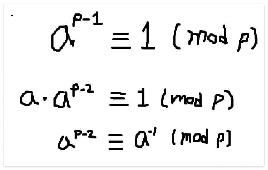 이제 이 때 페르마의 소정리를 적용할 수 있다. 페르마의 소정리와 합동식의 성질에 의해 다음의 식들이 성립한다.