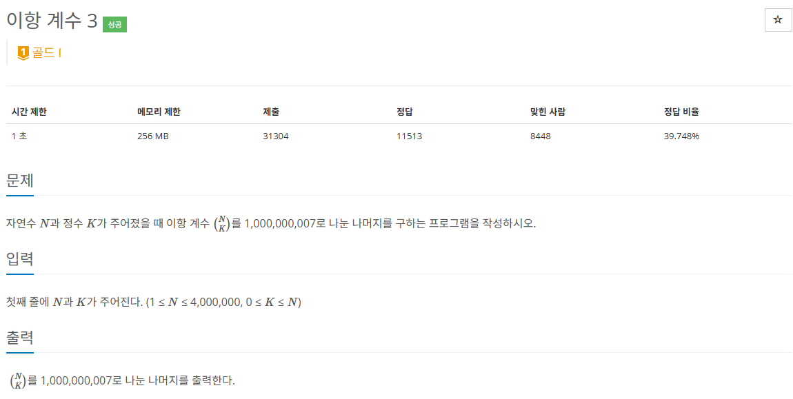 수학에 분할 정복이 더해진 문제다. 이항 계수 문제 자체는 PS에서 자주 등장하는 문제이지만, 보통은 파스칼 항등식 개념을 메모이제이션과 분할 정복으로 구현해서 풀 수 있느냐를 묻는다. 하지만 이 문제는 N과 K의 범위가 커서 메모이제이션을 활용하면 메모리 초과로 풀 수 없게 된다. 그렇다고 메모이제이션 없이 분할 정복만 사용하는 것은 시간 복잡도가 끔찍해지고, 조합론을 활용해서 풀려하면 분모든 분자든 오버플로우가 날 수 있다(모듈러 연산을 분자와 분모에 분배하는 것은 등식이 성립하지 않는다).