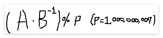 결국 저 식을 활용해야 하는데, n과 k의 범위가 너무 커서 오버플로우가 발생할 수 있다. 분모와 분자에 각각 모듈러 연산을 한 값은 실제 값에 모듈러 연산의 취한 값과는 달라서 저 꼴을 변형할 필요가 있었다. 일단 분자의 식을 A로 두고 분모의 식을 B로 둔 상태로 구하고자 하는 것은 다음과 같다.