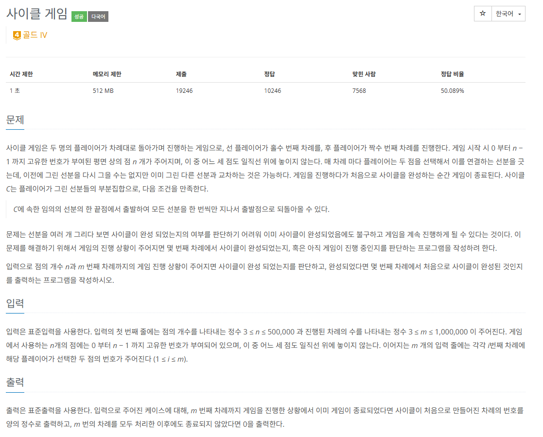 디테일한 요구 사항은 따로 없어서, 일반적으로 구현하는 Union Find를 그대로 이용하면 된다. 선택된 두 점이 이미 같은 집합 내에 있는 경우, 잇게 되면 사이클이 발생하므로 처음으로 선택된 두 점이 이미 같은 집합인 경우를 찾아내면 된다.