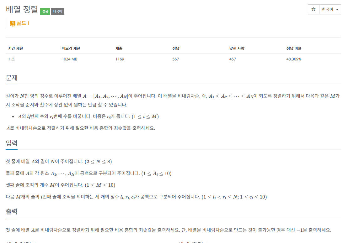 이 문제 조건에서 방문 상태를 효과적으로 나타낼 수 있는 방법은 여러가지가 있겠으나, 풀고 나서 보니 일반적으로는 해시 맵을 많이 택하는 것 같았다. 나는 문제를 풀 때, 해시 맵보다는 비트 마스킹이 먼저 떠올라서 비트 마스킹을 이용했다. 길이가 8인 배열의 인덱스 순서로 상태를 나타낸다고 치면 3bits(0~7에 해당하는 인덱스) * 8(배열의 길이)만큼 필요하므로 3Bytes 정도의 공간을 사용하게 되고, 이런 상태가 2^8개 존재하니까 768Bytes의 공간을 소모한다. 이 때, 비용을 int 값으로 저장하게 되면, 대략 3MBytes 정도를 방문 여부 저장을 위해 사용하게 됨을 추측할 수 있다.