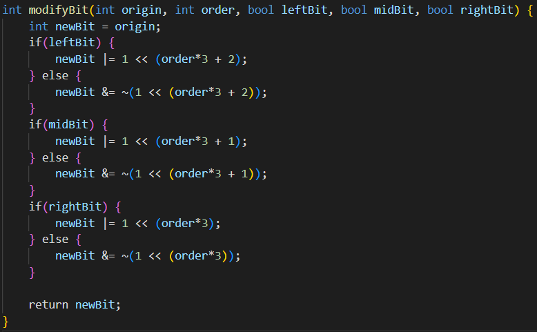특정 위치 인덱스에 들어있는 세 비트 값을 찾아내는 거야 shift 연산과 &연산을 쓰면 간편하게 할 수 있으나, 기존에 존재하던 상태 비트에 대해 특정 인덱스를 나타내는 세 비트를 원하는 비트들로 바꾸는 과정은 조금 코드가 길어진다(각 자리가 1인 경우와 0인 경우를 나눠서 처리해야 함). 그래서 나는 가독성을 위해서 그 부분은 함수를 따로 빼내었다.