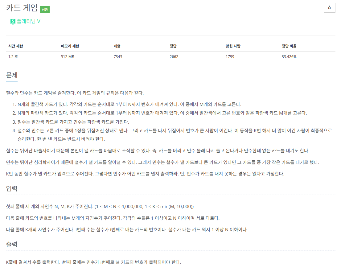 내가 Red-Black Tree, 그러니까 C++ set을 사용하게 된 건 이론상 가능할 것 같아서였다. set에서 upper_bound를 찾아내는 것은 O(logM)만큼 걸릴 것이고, 찾은 노드를 삭제하는 과정도 O(logM)만큼 걸릴 것이다. 그리고 이 과정이 카드를 내는 K번의 동작 내내 일어나게 될 것이므로 O(K * (2 log M)) 가 걸릴 것이다. 그리고 처음 set을 구축하는 과정이 O(m log m)만큼 걸릴 것이므로, 이론상 시간 초과가 나지 않아야 한다.