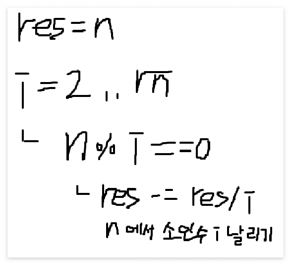 이런 로직인데, 2부터 sqrt(n)까지 n에 대한 인수인지 판별해서 인수라면, 그 인수로 만들 수 있는 모든 케이스를 res에서 빼준다(GCD가 1이 아니라는 의미이므로). 그리고 추후 중복된 인수 계산을 막기 위해 i를 소인수 취급해서 n에서 모두 날려버린다. n%i==0이라면, 계속해서 n /= i를 해서 n에 존재하던 i를 전부 없애는 방법으로 구현했다. 2부터 순차적으로 계산하고 있는 상황이므로, 결과적으로 소인수 분해했을 때 소인수 i에 대한 항을 나눠 없앤 꼴이 된다.