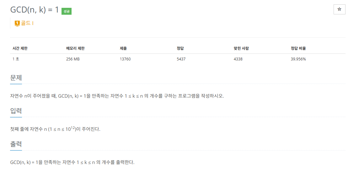 수학적 개념을 알고 있으면 쉽고, 모른다면 어려운 문제. 오일러 피 함수에 대해 알고 있다면 쉽게 구현할 수 있다. 나는 그 존재에 대해서 잘 몰랐는데, 풀고 나서 찾아보니 오일러 피 함수를 이용해서 푼 상태였다.