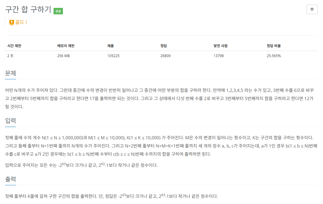 그 외에 신경쓰였던 것은 입력으로 주어지는 모든 수의 범위가 long long int의 범위라는 것인데, 정답이 long long int의 범위를 보장하지만 이러면 구간 합을 구해내는 도중에 오버플로우가 나지 않을까 하는 점에서였다. 그런데 잘 생각해 보면 정답이 long long int의 범위를 보장하므로, 중간에 오버플로우가 나더라도 결국에 구간 합을 구해내면 답을 정상적으로 출력되겠구나 싶었다(오버플로우가 범위를 초과하는 순간 무식하게 임의의 쓰레기 값이 들어가는 게 아니니까).