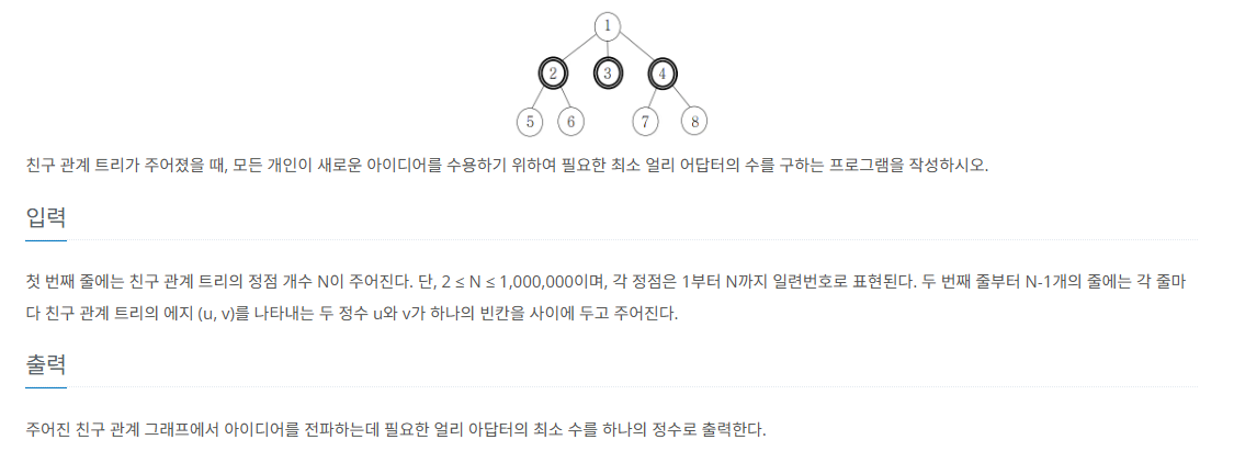 문제 해결을 위해 각 노드에 대해 고려해 보아야 하는 상태는 해당 노드가 얼리 아답터인 경우와 아닌 경우다. 문제에서 주어지는 그래프가 트리임을 보장하고 있으므로, 어떤 한 노드를 루트 노드로 설정하면 모든 노드에 대해 부모 노드와 자식 노드를 정할 수 있다.