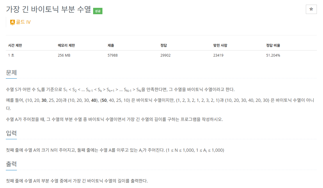LIS를 응용한 DP 문제. LIS 알고리즘을 공부했거나 관련 문제를 풀어봤다면 어렵지 않게 풀이 방법을 떠올릴 수 있다. 기준이 될 인덱스를 정해두고, 앞부분에 대한 LIS를 구하고 뒷부분에 대한 LDS를 구해서 더한 값에 1을(기준 값이 포함되어야 하기 때문에) 더해주면 끝이기 때문이다.