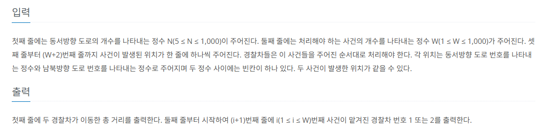 특정 i 번째 사건에 경찰차를 배정하려고 할 때, 이전까지 경찰차를 배정하는 경우를 떠올려 보면, { 1, 1, 1, 1, 1 }, { 1, 1, 1, 1, 2 }, { 1, 1, 2, 1, 1 }, { 1, 1, 2, 1, 2 } ... 와 같은 수열들이 될 것이다. 그리고 i번 째 사건에는 경찰차1 혹은 경찰차2를 배정하게 될 것이고, 이때 이동 거리 합에 영향을 주는 요소는 경찰차들이 직전에 처리한 사건(위치)뿐이다. 따라서 최소 이동 거리 합을 구하기 위해서는 각 경찰차의 직전 처리 사건 정보만 필요하지, 그 이전에 처리한 사건들의 경우 필요 없다는 것을 알 수 있다. 대신에, 문제에서 각 사건마다 어떤 경찰차를 배정했는지도 출력하도록 요구하고 있으므로, DP에서 자주 사용되는 캐싱 및 역추적 기법이 필요할 것이라고 어느 정도 예상할 수 있다.
