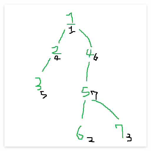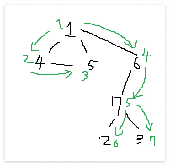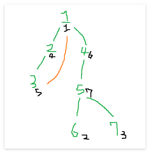 이 때 임의의 노드 1번 노드를 루트로 해서, DFS를 실행하면 위의 이미지에서 나타나는 순서대로 노드를 방문하게 될 것이다(자식 노드의 숫자가 작은 걸 우선해서 방문할 경우이다, 실제 문제를 해결한 알고리즘에서는 먼저 입력된 간선을 먼저 이용한다). 그리고 그 방문 순서를 가지고 DFS Spanning Tree로 만들면 아래와 같은 형태가 된다. 초록색 숫자는 방문 순서이고, 검은색 숫자는 실제 방문 노드를 의미한다.
