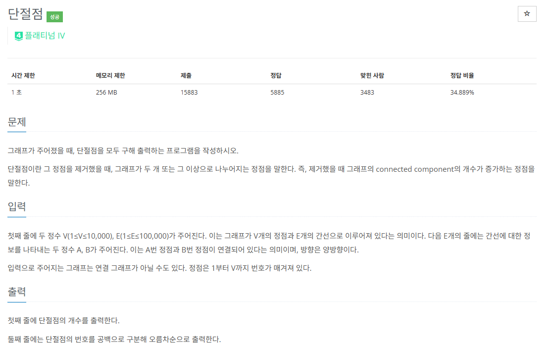 제목 그대로 단절점을 찾는 그래프 이론 문제다. 이건 정말 한참을 고민해도 떠오르지 않아서, 단절점 알고리즘을 따로 찾아 간단하게 공부하고 풀었다. 체감상 플레4 이상의 문제들은 슬슬 모르면 해법을 떠올리기 어려운 문제들이 등장하는 것 같다.