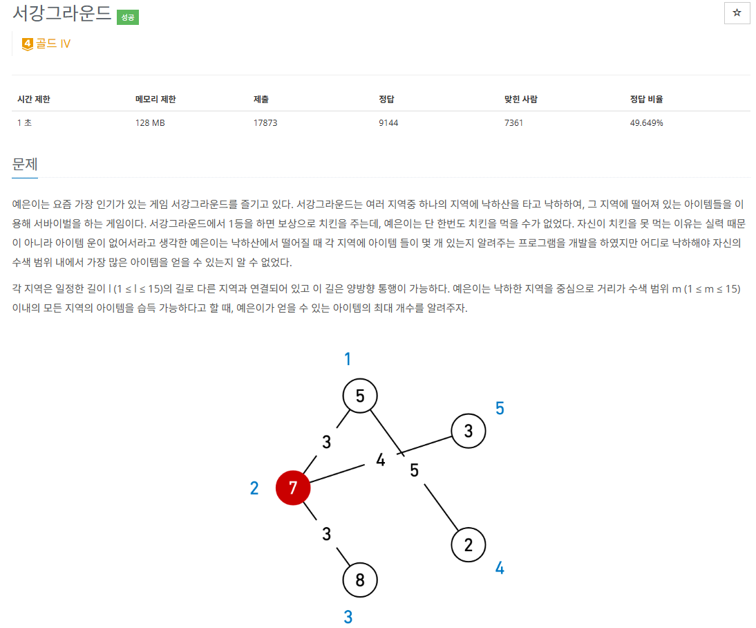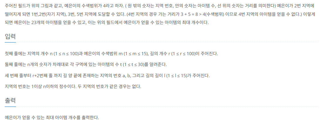 각 지역마다 다른 지역들까지의 최단 거리를 구해서, 수색범위 보다 작은 비용으로 도달할 수 있는 구역의 아이템 가치를 더해서 얻을 수 있는 아이템 가치 총합을 구한다. 그리고 어떤 지역에서 시작할 때 얻을 수 있는 아이템 가치 총합이 가장 큰 지 판별하면 끝이다.