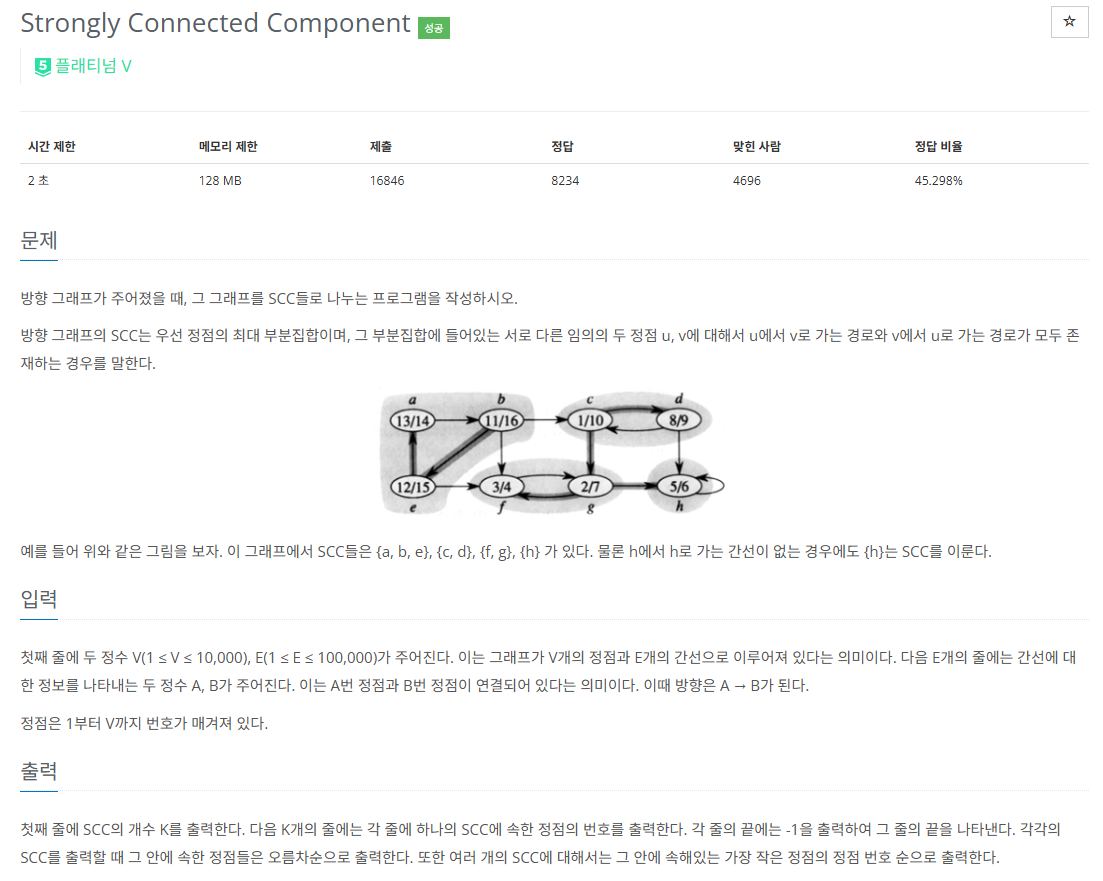 그래프 이론 중 SCC 문제. 전에 2-SAT 문제를 풀기 위해 익혔던 SCC 알고리즘을 연습해 보기 위해 따로 고른 문제다. SCC를 찾는 대표적인 알고리즘 중 하나인 코사라주 알고리즘을 어제 구현해 보았고, 타잔 알고리즘도 직접 구현해보고 싶어서 오늘 푼 문제에서는 타잔 알고리즘을 사용했다.