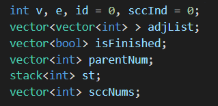 나는 isFinished 배열에 각 노드가 SCC 형성이 이미 끝났는지 여부를 저장했고, parentNum 배열에 부모 노드 값을 저장했다. 그리고 SCC 조건을 발견해서 되돌아갈 때, 여태 탐색한 순서의 역순으로 노드를 조회할 수 있어야 하므로 스택 st에 방문하는 노드들을 순서대로 저장해 이용했다.