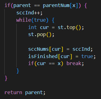 모든 자식 노드를 확인했을 때도, 여전히 부모 노드 값이 나 자신이라면, 현재 노드가 한 SCC의 부모 노드라는 뜻이 된다. 따라서 st에 있던 여태 방문했던 노드들을 역순으로 빼내어 한 SCC로 묶어준다. 이때, 종료 조건은 당연히 스택에서 자신을 빼내는 시점이다.