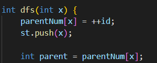그다음엔 재귀를 활용하기 위해 dfs 함수를 작성했다. 실제 노드의 번호와 관계없이, 방문하는 순서대로 고유의 번호를 부여하기 위해서 전역변수를 선언해 dfs에 진입할 때마다 증가시켰다. 그리고 방문한 노드의 부모 노드 번호는 일단 본인으로 지정한다. 방문했으므로, 스택 st에 넣어준다.