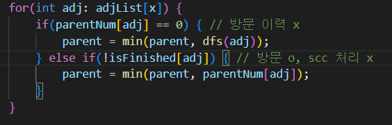 } else if(!isFinished[adj]) { // 방문 o, scc 처리 x
