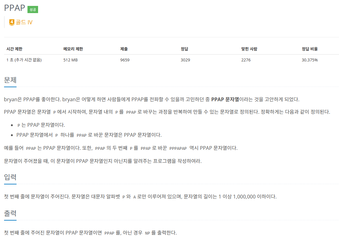 그래서 스택을 이용했다. 스택에 쌓인 상위 3개 원소와 입력 받은 문자를 포함해 "PPAP"가 이뤄지면 스택에 "P"를 집어넣고, 아니라면 뺐던 원소들과 입력받은 문자를 그대로 집어넣었다. O(n)의 시간복잡도로 무난하게 패스했다.