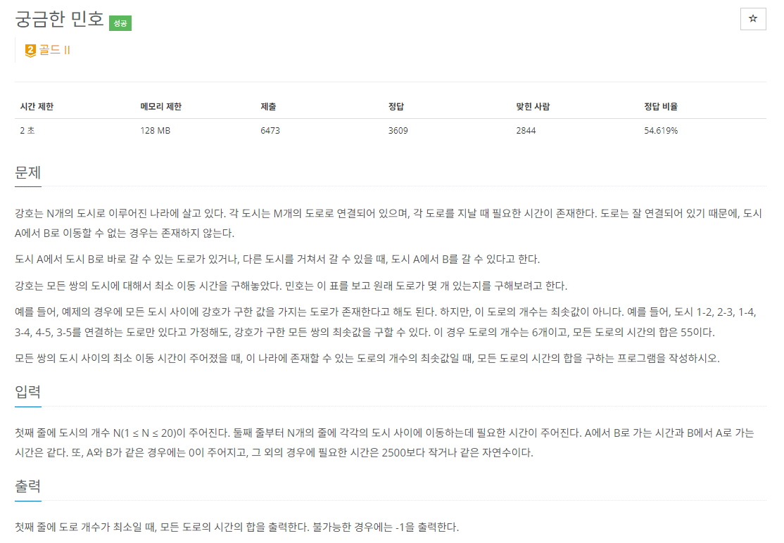 그래프 이론 문제다. 처음 문제를 가볍게 읽었을 때는 최소 스패닝 트리 문제인 줄 알았다. 하지만 문제를 꼼꼼하게 읽다 보니 개성 있는 문제라고 느꼈는데, 각 노드에서 목적 노드 별 최단 거리가 주어지고 최소 간선으로 그 그래프를 만들었을 때 간선의 비용 총합을 추측하는 문제였다.