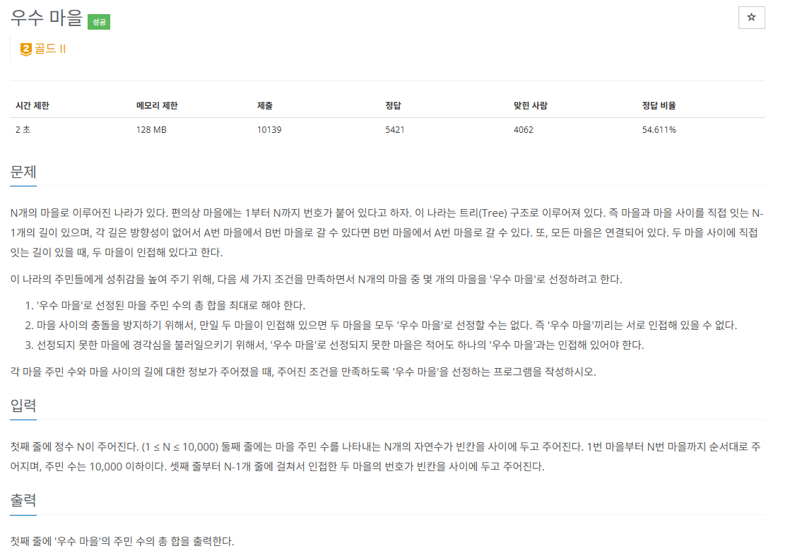 따라서 dp 값을 계산할 때 어떤 마을이 일반 마을인 경우와 우수 마을인 경우로 나눈 다음에 트리 탐색 과정에서 이를 조건에 맞게 처리해 주어야 한다.