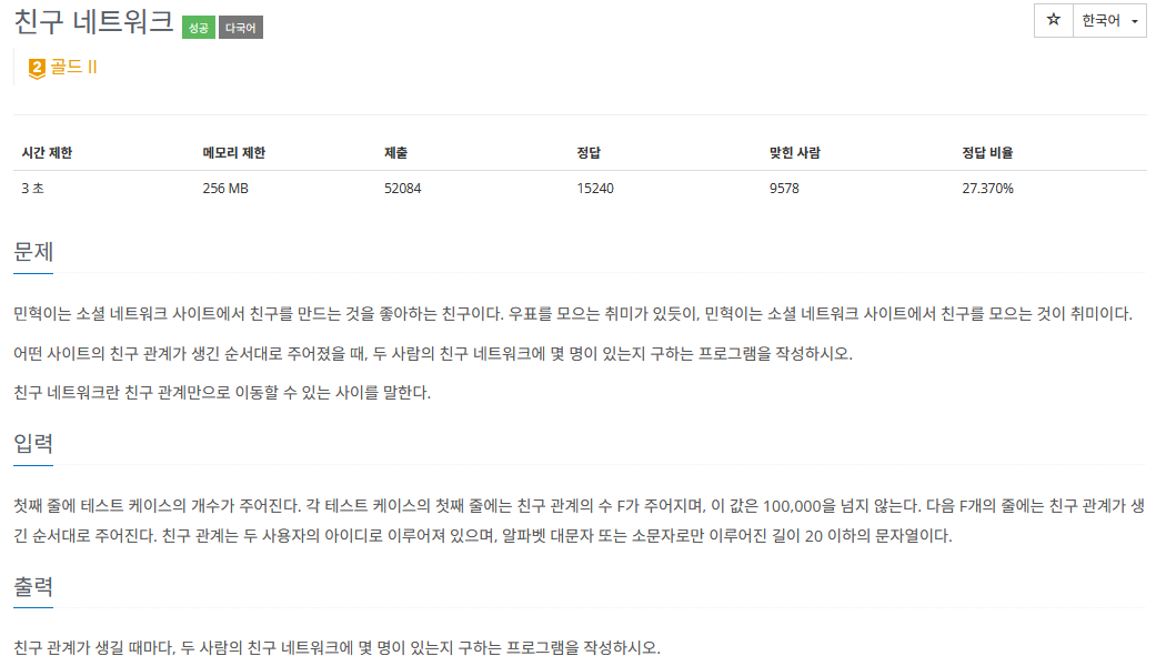 분리 집합과 해시를 이용하는 자료구조 활용 문제다. 문제를 유심히 읽어보면 알 수 있듯이, 친구 집합이 계속해서 합쳐져야 하고 특정 아이디의 유저가 속한 친구 집합을 빠르게 조회할 수 있어야 한다. 따라서 분리 집합을 활용해 이를 효율적으로 처리할 수 있다.