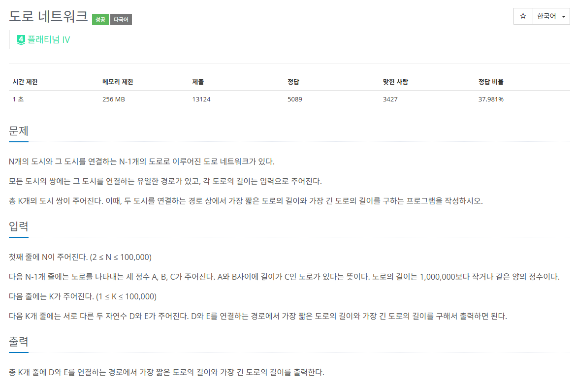 이후에는 평범하게 희소 배열 초기화 과정에서 2^x번째 조상에 대한 최장, 최단 도로를 둘 다 비교 및 저장해 가며 초기화해 주면 된다. 쿼리도 일반적인 희소 배열 이용 LCA 문제와 다를 바 없이, 깊이가 더 깊은 노드의 높이를 올려 맞춰주고 LCA를 탐색하며 그 과정에서 최장, 최단 도로를 찾아준다. 그리고 각각의 LCA까지의 최장, 최단 도로 값을 비교해 최종적인 쿼리 답을 출력해 주면 끝이다.