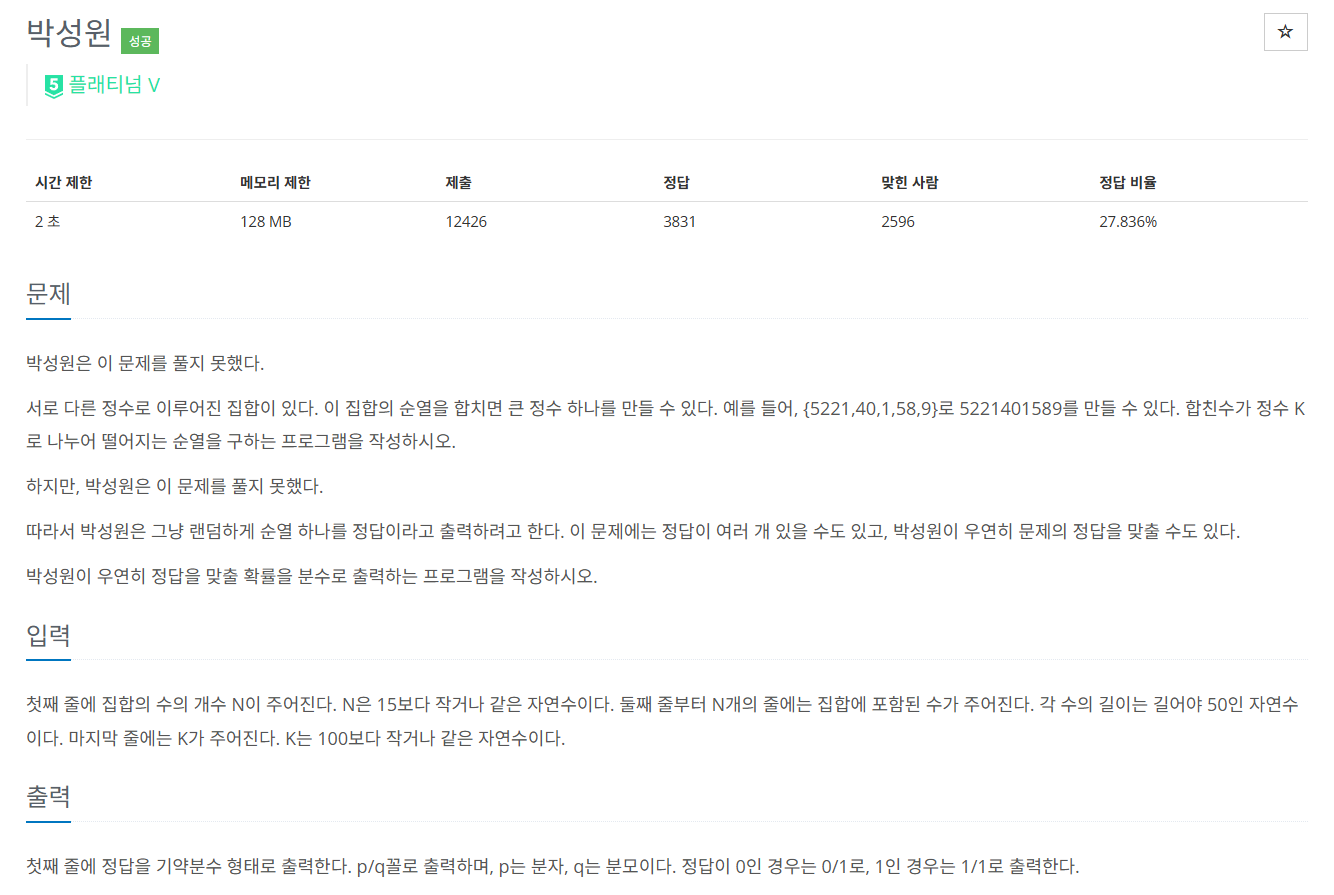 DP 문제인데, 생각보다 발상이 까다롭다. 당연히 모든 순열을 완전 탐색했다간 15!가지의 경우를 탐색해야 하므로 시간 초과가 발생한다. 그리고 집합에 포함된 수도 길이가 50까지인 자연수 범위로 상당히 크기 때문에, 수를 만든 후에 모듈러 연산을 적용하는 부분도 쉽지 않다.