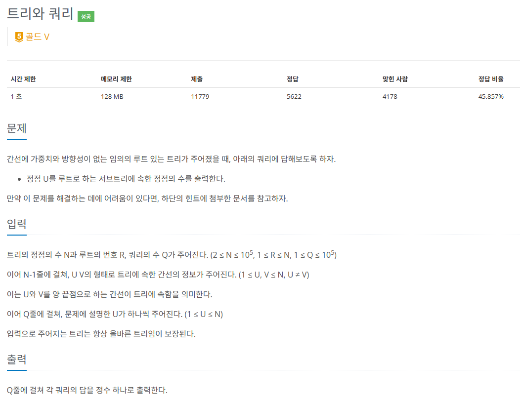 임의의 루트와 간선의 정보가 주어지기 때문에, DFS나 BFS로 트리 내의 부모 자식 관계는 찾아낼 수 있다. 물론 그 정보를 바탕으로 각 쿼리에 대해 매번 탐색을 통해 서브트리의 정점 수를 세면 O(N*Q)로 당연히 시간 초과가 난다. 그래서 DP 문제를 풀듯이 각 정점을 루트로하는 서브트리의 정점 수를 저장해놓고, 쿼리들에 대해 바로 답을 출력해주도록 해야한다.