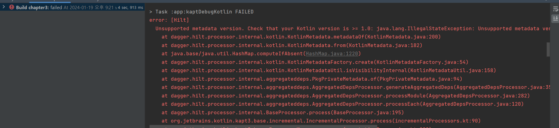 + 해결된 줄 아니었는데, 막상 retrofit 관련 repository랑 인터페이스들 구현해놓고 디버그 모드로 빌드했더니 또 오류가 생겼다. 아무래도 사용 중인 Hilt의 버전과 지금 코틀린의 버전이 호환 자체가 안되는 거 같다. 찾아보고 수정해야 할듯..