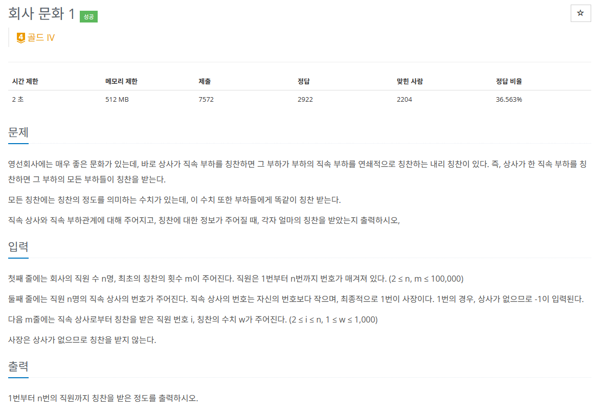 이것도 위 문제와 비슷하게 DP+트리 문제이다. 칭찬 수치는 별 조건 없이 자신의 부하 직원들에게 재귀적으로 전달되고 단순 합이다. 그래서 칭찬 정보가 주어질 때마다 트리를 탐색하면서 부하직원(자식 노드 및 후손 노드)들에게 칭찬 점수를 업데이트 해줄 필요가 없다. 각 직원마다 받은 칭찬 점수를 모두 더해놨다가, 모든 칭찬에 대한 정보를 받고나서 최종적으로 업데이트 하면 된다.