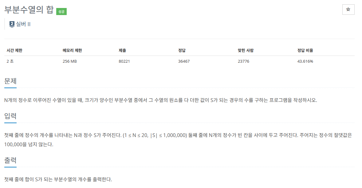 착각하고 있던걸 바로잡고나니, 모든 부분집합을 탐색해봐야 하는 조합문제가 되었다. 하필 수열엔 음수와 0이 존재할 수 있어서 탐색 중에 pruning 할 수 있는 케이스가 거의 없을 거 같았다. 그래서 무식하게 (1Cn+2Cn+...+nCn)n 번의 탐색이 필요할 거 같았는데, n이 작아서 얼추 가능하지 싶었다. DFS와 백트래킹으로 구현하고 통과했다.
