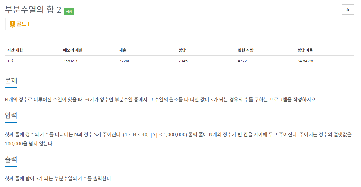 하나 특이할 것이라고 한다면 s(문제에서 말하는 S값)이 0일 경우, cnt값을 하나 빼주고 있다. s가 0인 경우에는, 탐색과정에서 왼쪽 수열에서 아무것도 고르지 않은 경우+오른쪽 수열에서 아무것도 고르지 않은 경우의 케이스가 하나 포함되기 때문에(문제조건에서 크기가 양수인 부분수열로 제한됨) 이를 제외해준 것이다.