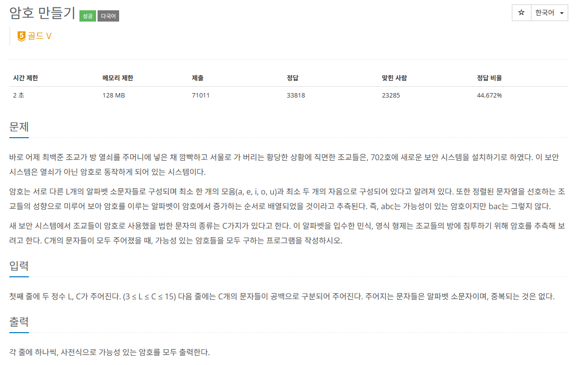 주어지는 문자들을 받은 다음, 오름차순 정렬해두고 DFS로 조합을 찾으면 바로 해결 되는 문제이다. 조합의 수가 가장 많아지는 케이스는 C가 15이고, L이 7또는 8인 경우로, 시간은 충분하다. L개의 문자를 선택한 시점에, 자음 수와 모음 수의 조건만 추가로 확인해주면 된다.
