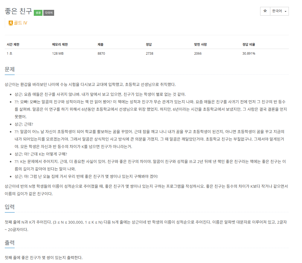 큐와 이름길이별 학생 수 배열을 이용하면 쉽게 해결되는 문제. 슬라이딩 윈도우로 구현해서 풀면 된다. 큐에는 K개 이하의 원소만 저장되게 하고, 학생 이름을 하나씩 입력 받는다. 이 때, 큐가 넘쳐있던 상태라면 큐의 front를 제거하면서 이를 이름길이 배열에 반영해준다. 이렇게 되면 큐와 배열엔 입력 받은 학생으로부터, K등 위의 학생들 정보까지만 존재하는 상태가 된다. 이름 길이 배열을 찾아 입력받은 학생의 이름 길이에 해당하는 값을 결과에 더해준 뒤, 입력 받은 학생을 큐에 넣고 배열에도 반영한다.