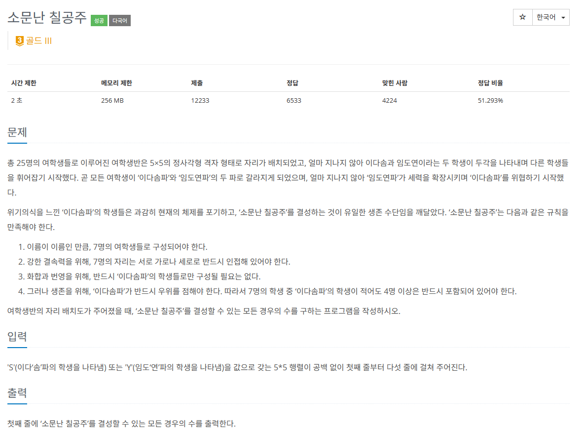 - 남은 모든 조합에 대해서도 반복하여, 모든 소문난 칠공주 결성 가능 경우의 수를 찾고 이를 출력한다.