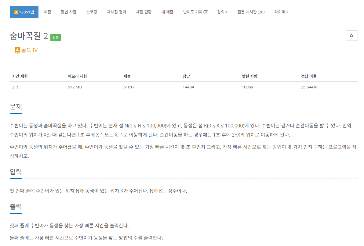 저번에 풀었던 숨바꼭질 문제와 유사하지만 조금 다르다. 이번에는 가장 빠른 시간으로 동생을 찾는 방법의 수도 출력해야하기 때문에, 저번처럼 BFS를 하면서 단순하게 방문여부로 pruning 할 수 없다. 단순한 방문여부 대신 가장 처음 방문했을 때가 몇 초인지를 저장하는 방식으로 접근해볼 수 있다. 이렇게 되면 이후 탐색 도중 같은 점을 방문하게 되었을 때, 현재의 초와 방문기록에 저장된 초를 비교해 현재의 초가 더 크다면 pruning 할 수 있다. 그리고 반복문의 초반부에 최단 시간으로 찾는 방법이 찾아진 상태인지 확인하고, 그 여부에 따라 가망이 없는 탐색을 중단할 수도, 또다른 최단 시간 도달 방법이라면 카운트에 더해줄 수 있을 것이다. 실제로 코드로 구현하면 다음과 같다.