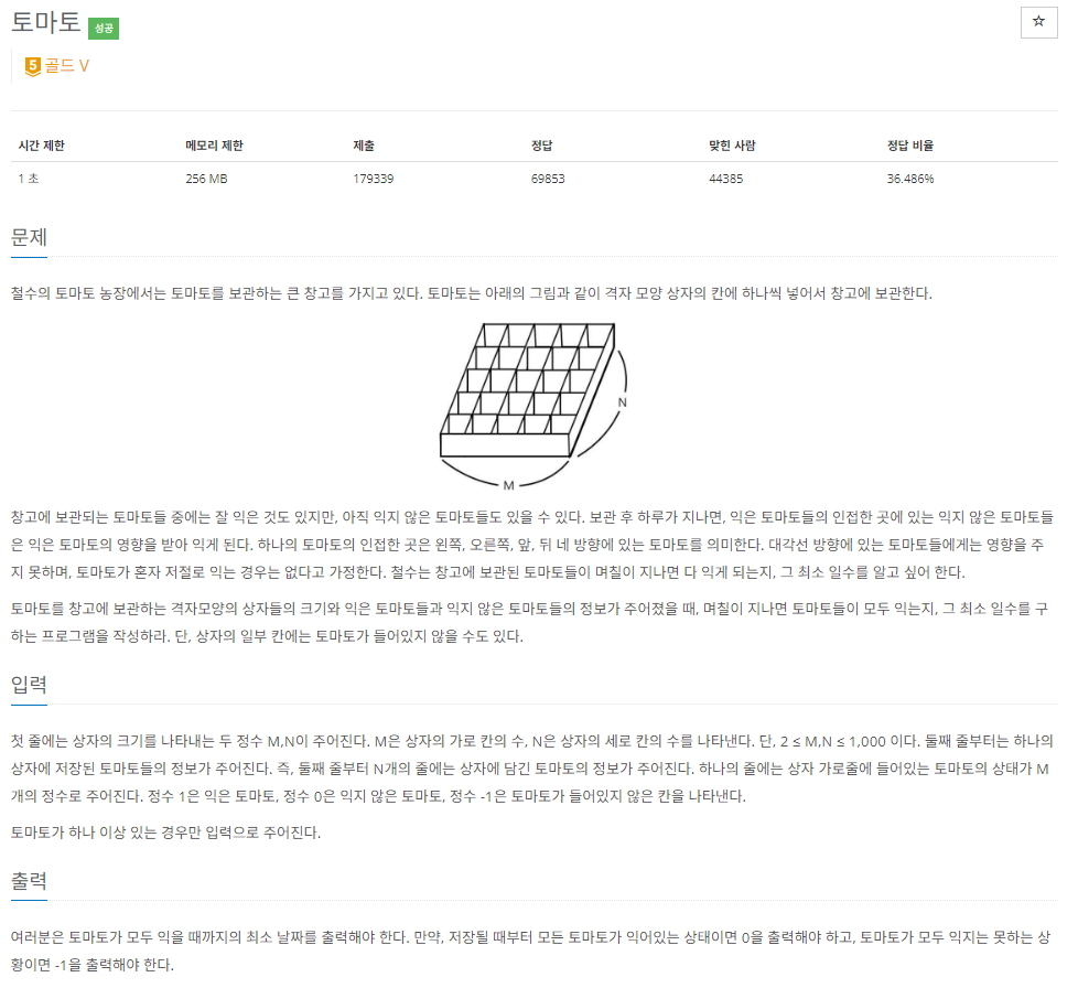 이것도 BFS 문제인데 관성적으로 풀다가 조금 헤맸다. 익은 토마토들의 위치를 저장해놨다가 각각에 대해 BFS를 하는 식으로 처리하려고 했다가 시간초과가 났다. 매번 모든 부분을 탐색하게 되지 않도록, 숙성에 걸리는 일 수를 업데이트 해주며 나름 pruning을 했음에도 그랬다. 생각을 바꿔서 처음부터 큐에 모든 익은 토마토의 위치를 넣어두고 시작하고서야 해결할 수 있었다. 시작할 때 큐에 꼭 원소를 하나만 넣고 시작할 필요는 없는데, 생각이 갇혀 바로 떠올리지 못한게 아쉬웠다.