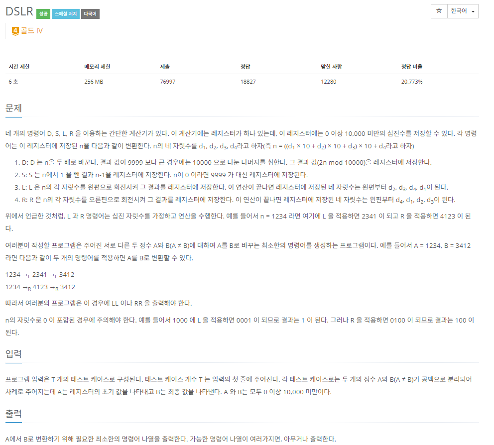 BFS를 이용한다는 것과 로직은 이전 문제들과 흡사하다. 처음에는 큐에 현재까지의 명령어 문자열도 함께 담기도록 했는데, 시간 초과가 났다. 아무래도 문자열의 복사가 반복되다보니, 명령어가 길어질수록 문제가 생길 수 있을 것 같았다. 그래서 그냥 큐에서는 명령어 문자열 대신 직전 값과 직전 명령어가 담기게 했고, 방문 배열에 이를 기록할 수 있도록 했다.