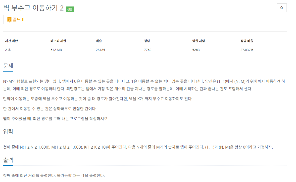 방문처리를 할 때 현재 부순 벽의 수 별로 따로 처리해주는 것만 신경쓰면, 다른 BFS 최단 경로 찾기와 같다. 나는 현재까지의 경로 길이를 방문 처리할 때 이용했는데, BFS의 특성상 굳이 그렇게 안하고 방문 여부만 이용했어도 괜찮았을 것 같다.