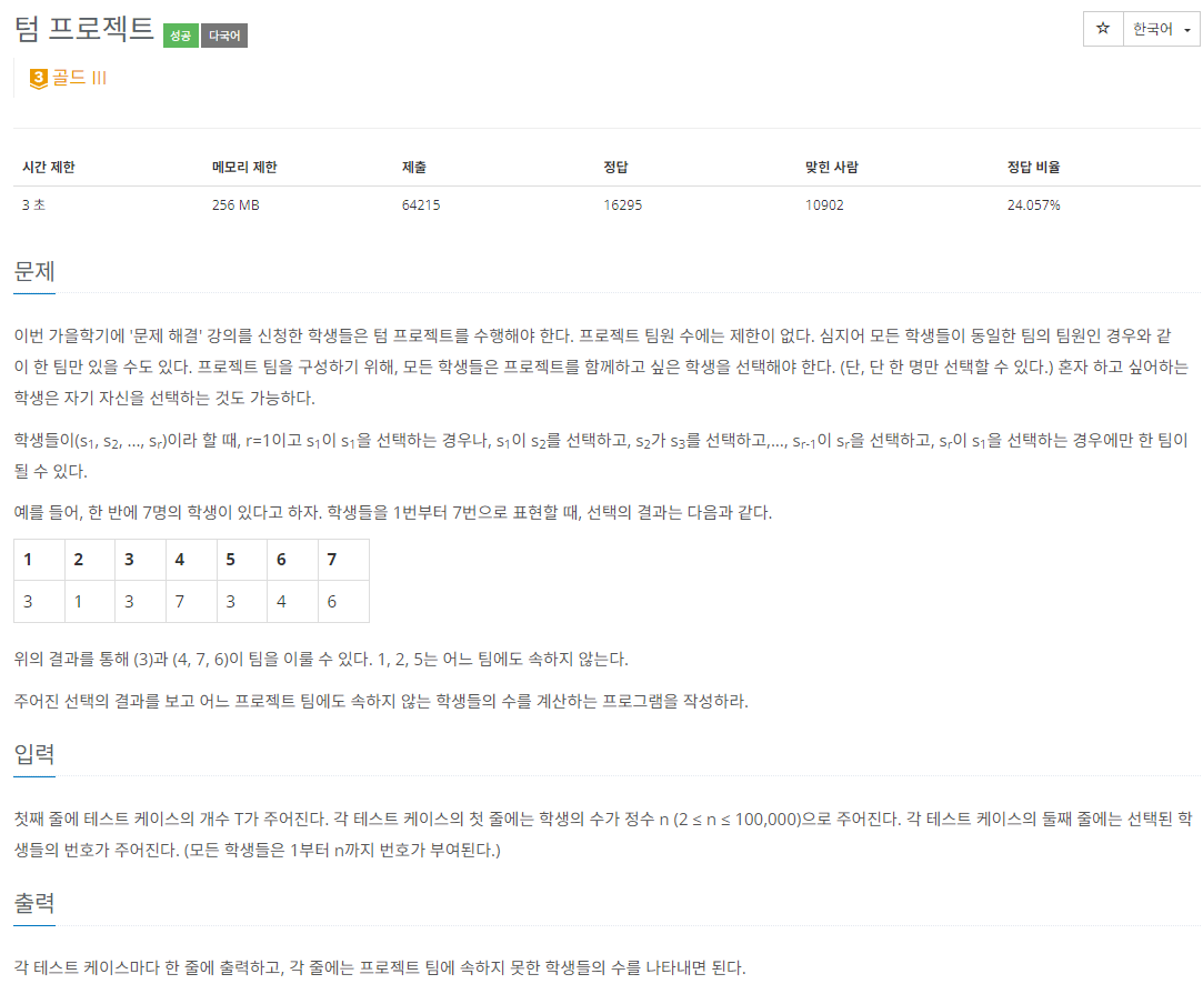 사이클에 포함되지 않는 원소의 수를 찾는 문제이다. DFS를 사용하는 것은 명확했는데 시간초과 때문에 애를 먹었다. 스택을 사용해서 풀려고 시도하니까 자꾸 시간초과가 났다. 탐색에 있어서 방문처리를 위한 자료구조와 사이클을 위한 자료구조를 따로 사용하다보니, 그렇게 된 것 같다.