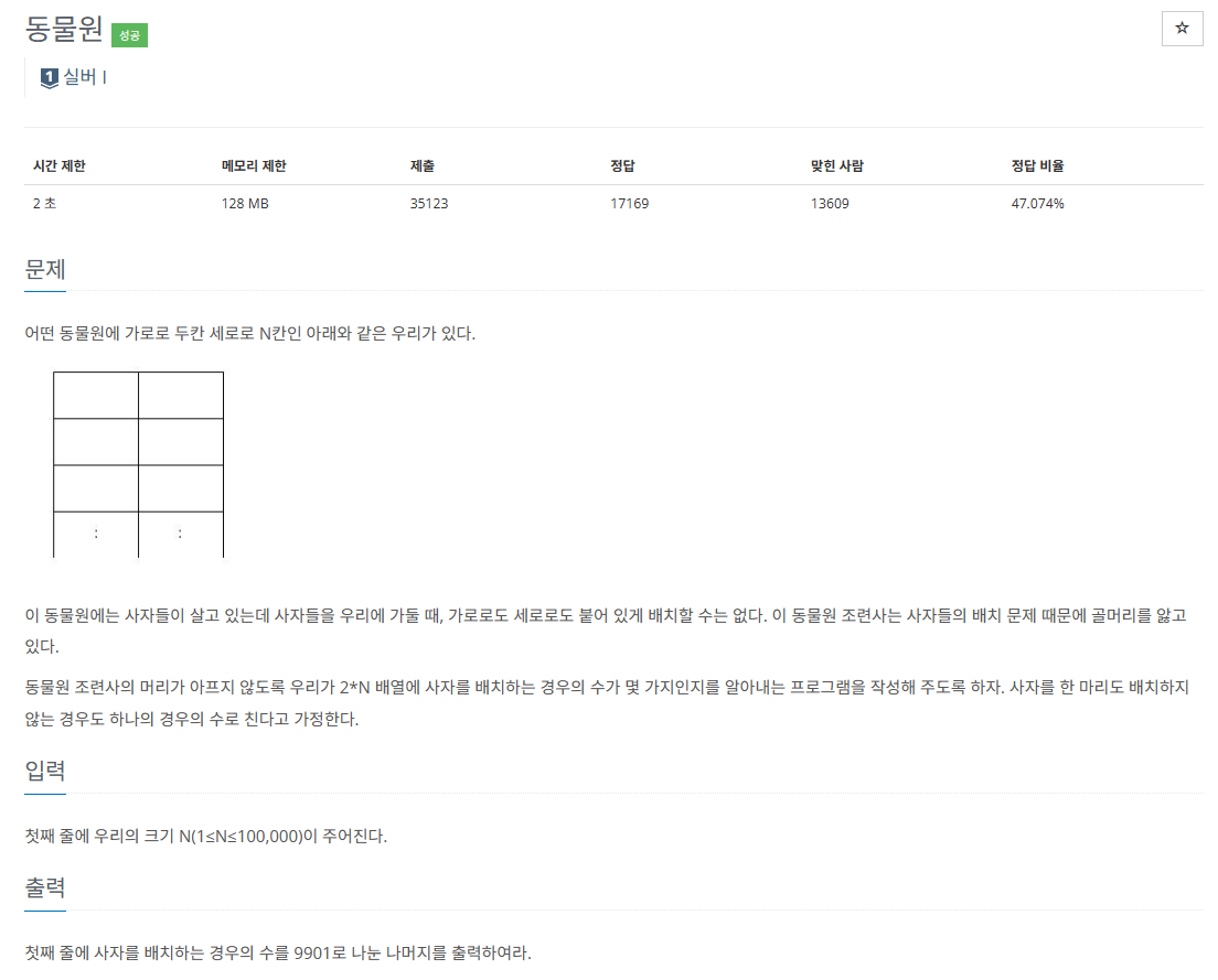 따라서 앞의 행에 사자가 없는 경우에는 사자가 배치되는 경우가 2가지 생길 수 있고, 앞의 행에 사자가 있는 경우에는 배치되는 경우가 1가지가 생기게 된다. 그리고 첫 행에, 사자가 없는 경우 1가지, 사자가 있는 경우 2가지(왼쪽, 오른쪽)로 둘 수 있으므로, 이에 대해 점화식을 적용한 DP를 구현하면 쉽게 해결할 수 있다.