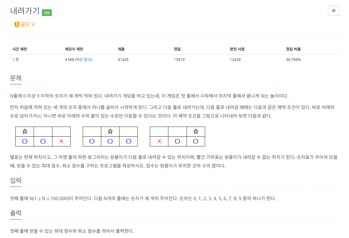 하지만 조금만 생각해보면, 이 문제 또한 DP를 적용할 때 필요한 것은 별표의 위치별 직전 최대, 최소값들 뿐이다. 해당 값들만 있다면 문제 조건에 맞추어 내려가기를 한 결과를 구해낼 수 있다. 따라서 입력을 받으며 한 줄씩 DP로 처리해주고, 마지막에 얻어진 위치별 최대, 최소값들을 최종적으로 비교한 최대, 최소값을 구해 출력하면 해결된다.