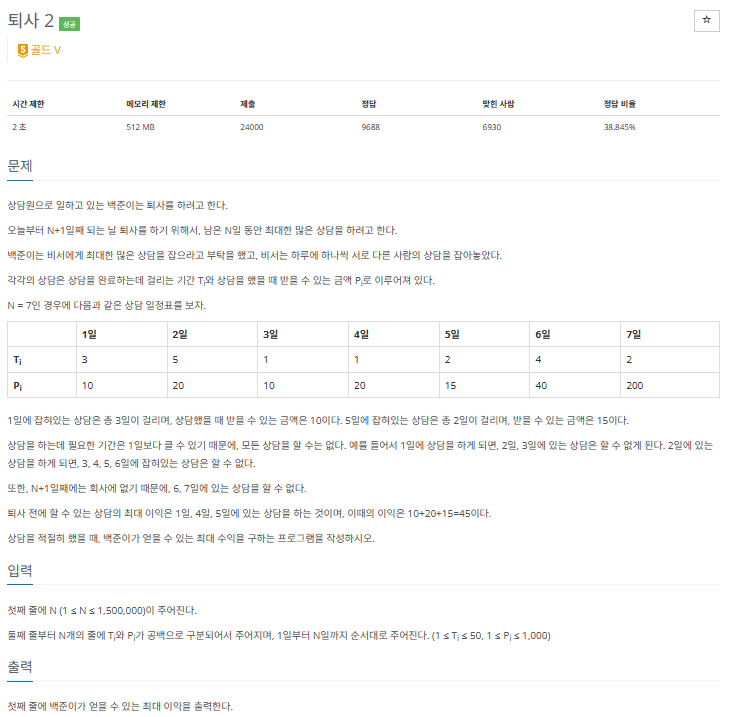 이번 문제도 DP 문제이다. 입력으로 들어오는 n이 1,500,000개까지 주어질 수 있기 때문에, 문제를 보자마자 떠올릴 수 있는 O(n^2)의 방법으로는 해결할 수 없다. DP로 풀게 되면 O(n)이 될 것 같아서, 그렇게 접근해봤는데 선뜻 점화식이 명확하게 떠오르지 않았다. 1일차 상담 일정부터 탐색하게 되면 기간에 따른 제약사항을 반영하기 까다로웠다.
